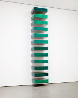 ResponderEliminarPero el ámbito de los objetos minimalistas no es un campo indiferenciado; Judd, también pensaba que la escultura necesita lo que él llamaba "polarización", una tensión fundamental. Aquí, por ejemplo, las cajas uniformes, de metal descubierto por arriba, por abajo, hacen pensar en líneas de montaje industrial. Al mismo tiempo en el frente y los costados llevan una capa de laca verde que, aunque sea pintura de automóviles, está aplicada con cierta irregularidad y tiene un jugoso atractivo.